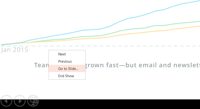 PowerPoint also includes controls on the lower left of the slideshow view, along with options in the right-click menu to switch slides or jump to a specific slide.