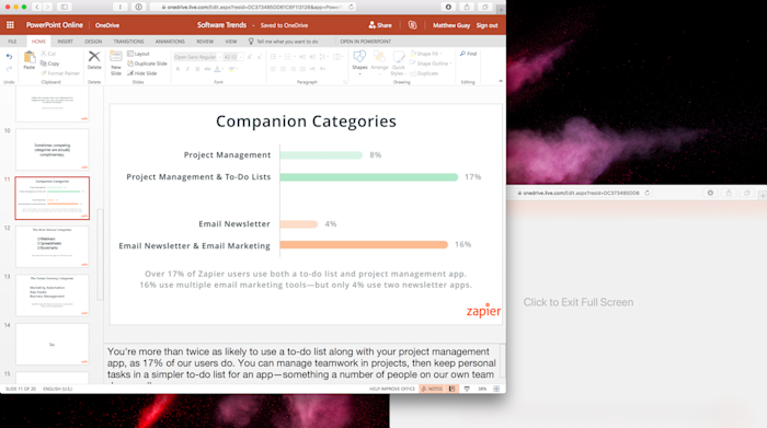 PowerPoint Online doesn’t include presenter view to show lecture notes on one screen while presenting your presentation on another—but there’s a workaround. While you’re giving your presentation full-screen, your browser with the original PowerPoint Online tab won’t show your slide content (Chrome hides the original window; Safari shows a Exit Full Screen placeholder). Instead, you can open a new tab or window and open your presentation there as well.