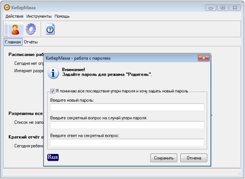 Из названия понятно, что эта утилита должна обеспечить маму контролем за своим чадом. Настройки времени пользования тут очень гибкие: возможно ограничение по общему времени пользования за день и времени непрерывной работы. Кроме того, можно с точностью до минут распределять перерывы при работе за компьютером, устанавливать график работы на каждый день недели, разрешать и запрещать доступ в интернет и использование определенных программ, а также получать подробные отчеты о действиях вашего ребенка за компьютером. В отличии от многих похожих программ, компьютер не блокируется моментально при окончании периода работы, а отправляет несколько уведомлений и приближающемся завершении сеанса.